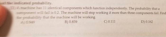 MoCOO 0133 0795 0206 0927. Statistics QA Library A machine has 11 identical components which function independently. A machine has 11 identical components which function independently. The probability that a component will fail is 02. Find the probability that the machine will be. A machine that produces a special type of transistor a component of computers has a 2 defective rate.